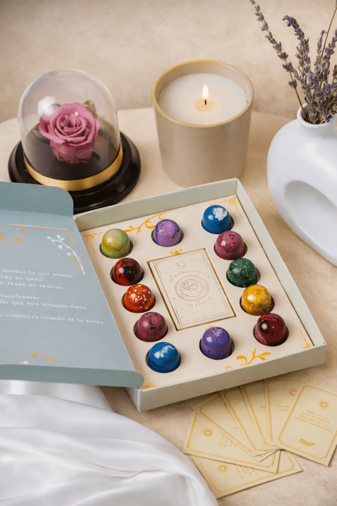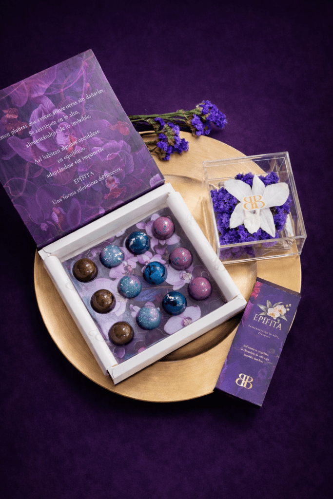 Una colección de Doce bombones de chocolate 70% cacao que exploran matices, contrastes y equilibrios, creados alrededor de la idea de crecer de maneras distintas y en lugares inesperados.